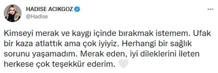 - HADİSE’DEN İLK AÇIKLAMA… Çıkan haberlerin ardından Hadise’den kaza açıklaması geldi. Ünlü isim, “Kimseyi merak ve kaygı içinde bırakmak istemem. Ufak bir kaza atlattık ama çok iyiyiz. Herhangi bir sağlık sorunu yaşamadım. Merak eden, iyi dileklerini ileten herkese çok teşekkür ederim” ifadelerini kullanmıştı. (Milliyet)