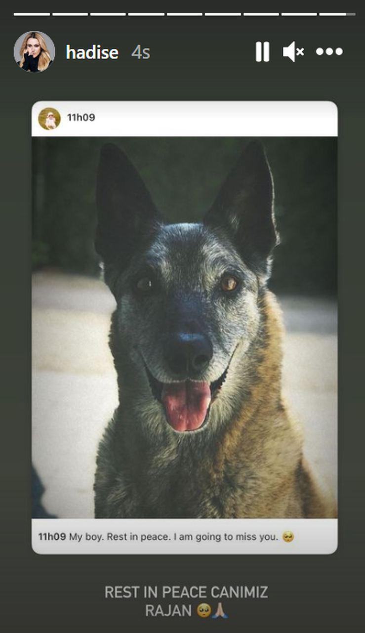 - ABLASININ PAYLAŞIMINI ALINTILADI… Hadise, küs olduğu ablası Hülya Açıkgöz’ün hayatını kaybeden köpeği Rajan’ı “Huzurla uyu canımız Rajan” notuyla paylaştı.