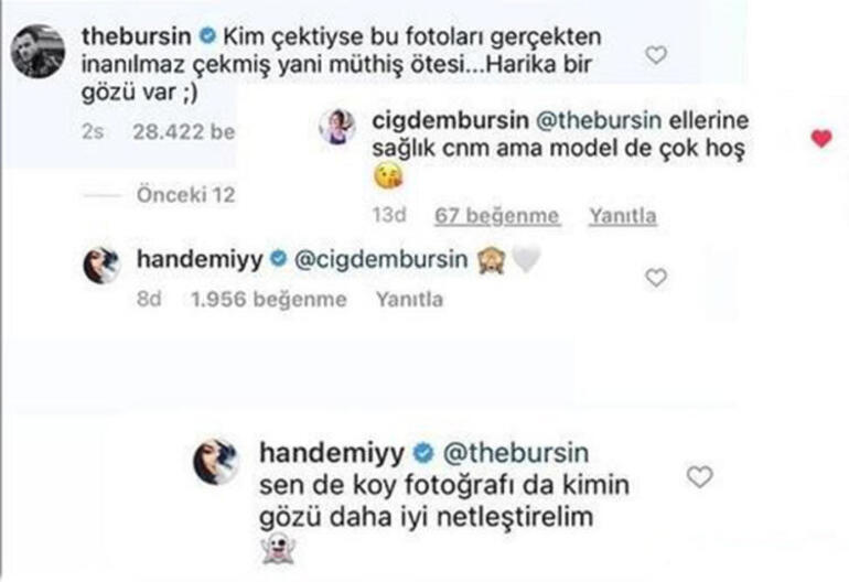 - KEREM BÜRSİN’İN ANNESİNDEN HANDE’YE YORUM… Hande Erçel, dizideki partneri Kerem Bürsin’in objektifine yeni pozlar vermiş ve bu kareleri sosyal medya hesabından yayınlamıştı. Erçel’in paylaştığı karelerin altına Kerem Bürsin, “Kim çektiyse bu fotoğrafları gerçekten inanılmaz çekmiş. Müthiş ötesi! Harika bir gözü var” yorumunu yapmıştı. Bürsin’in annesi de Erçel’in fotoğraflarına sessiz kalamamıştı. Çiğdem Bürsin, oğlu Kerem Bürsin’e, “Ellerine sağlık canım. Ama model de çok hoş” diyerek destek vermişti. Hande Erçel de Kerem Bürsin’e yanıtında kendisinin çektiği fotoğrafları da onun yüklemesini isterken; Çiğdem Bürsin’e de kalp emojisi yollamıştı. (Milliyet)