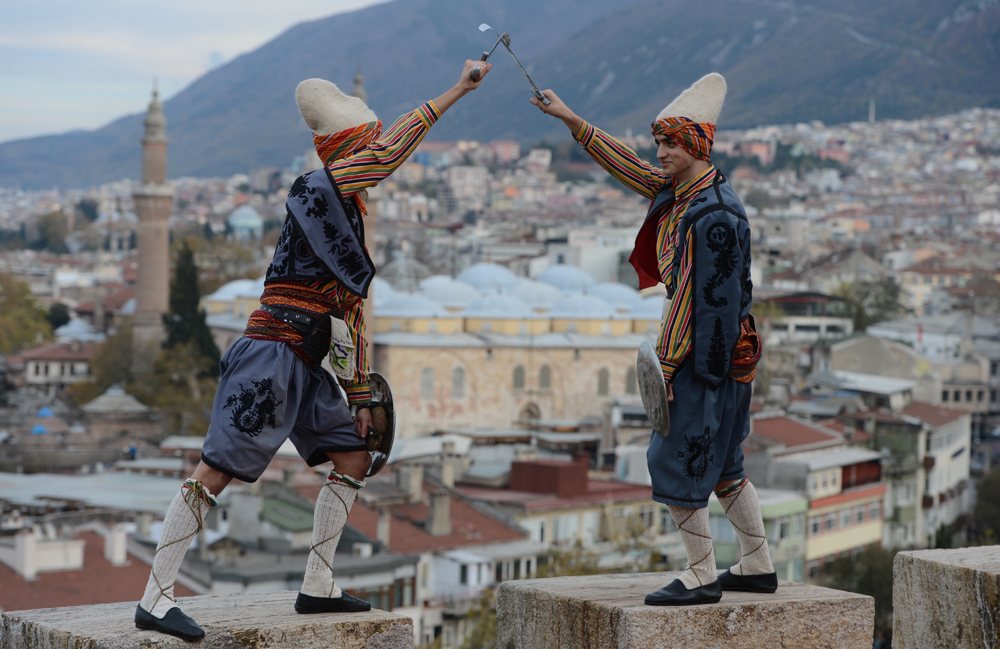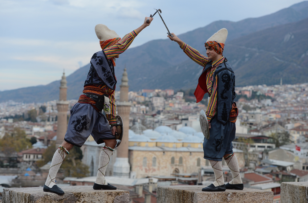 Yaklaşık 700 yıllık bir tarihe sahip olduğu tahmin edilen, dünyada müziksiz oynanan ender oyunlardan biri olan Osmanlı payitahtı Bursa’ya özgü kılıç kalkan halk oyunu, “Yurtta sulh, cihanda sulh” vurgusuyla yıllardır “barış” mesajı veriyor.