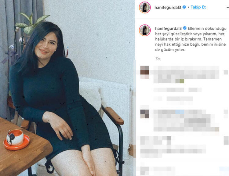 - MİNİ ETEKLİ POZLAR DİKKAT ÇEKMİŞTİ… Hanife Gürdal, son dönemlerde mini etekli pozlarıyla gündeme gelmişti. Sosyal medya fenomeni paylaşımına, “Ellerimin dokunduğu her şeyi güzelleştirir veya yıkarım, her halükarda bir iz bırakırım. Tamamen neyi hak ettiğinize bağlı, benim ikisine de gücüm yeter” notunu düşmüştü.