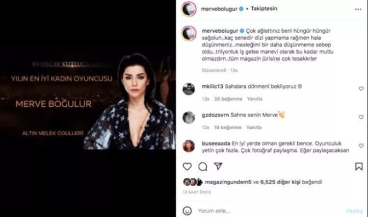 - Uzun süredir ekranlardan uzak olan Merve Boluğur, Altın Melek En İyi Kadın Oyuncu ödülüne layık görüldü. Ünlü oyuncu gözyaşlarına hakim olamadı ve mutluluğunu da Instagram hesabından paylaştı.