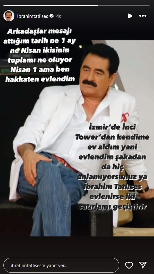 - Yeni paylaşımda şaka yaptığını belirterek şunları söyledi: “Arkadaşlar mesajı attığım tarih ne 1 ay ne Nisan… İkisinin toplamı ne oluyor? Nisan 1 ama ben hakikaten evlendim. İzmir’de kendime ev aldım. Yani evlendim şakadan da hiç anlamıyorsunuz ya. İbrahim Tatlıses evlenirse iki satırla mı geçiştirir?”
