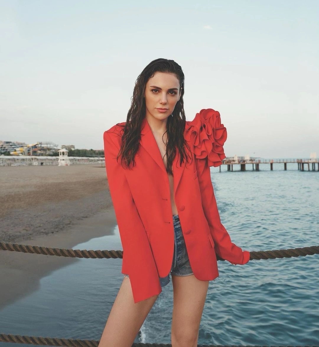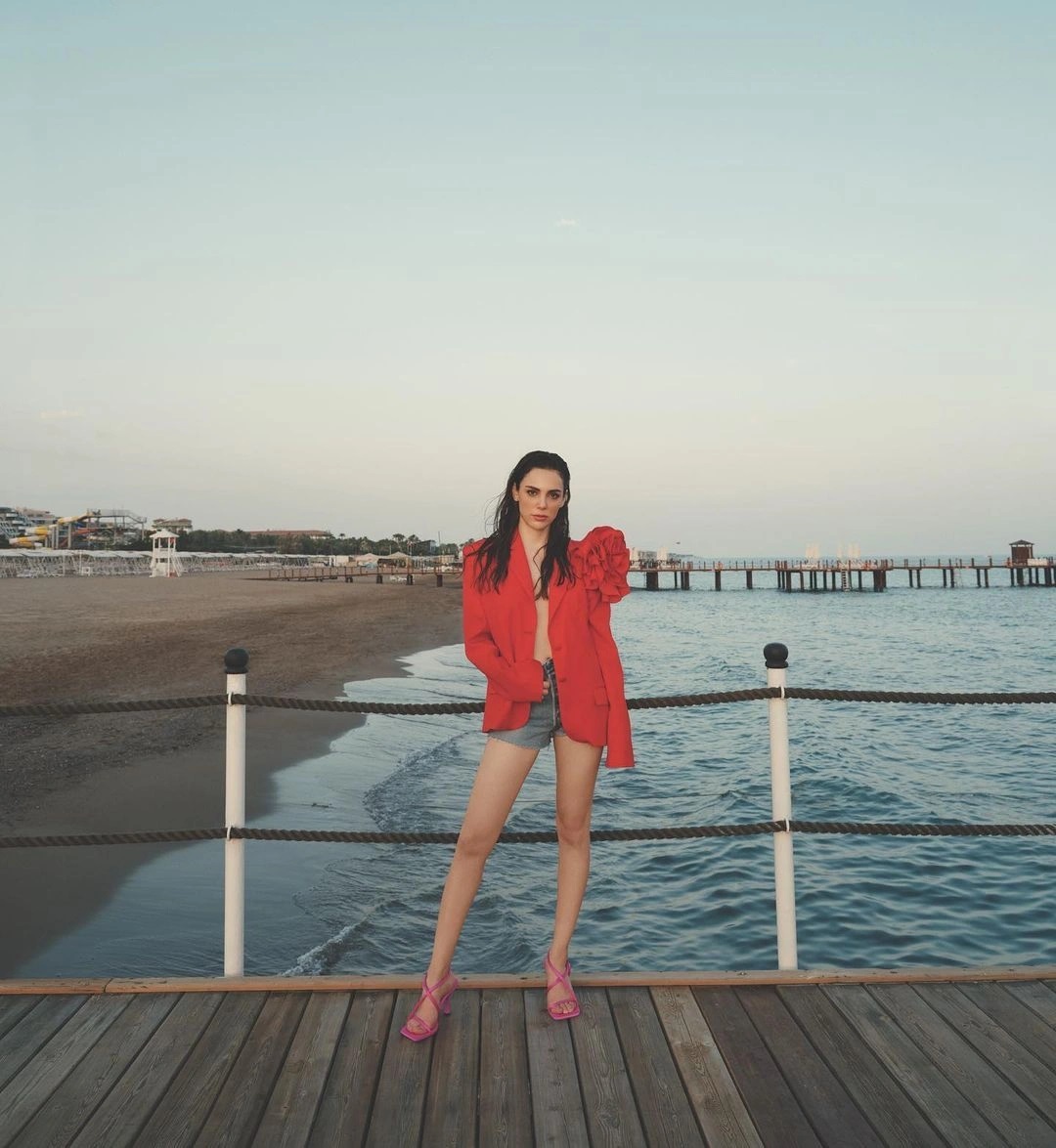 - Tanrısevsin, mini şortlu ve kırmızı ceketli sütyensiz pozunu paylaştı.