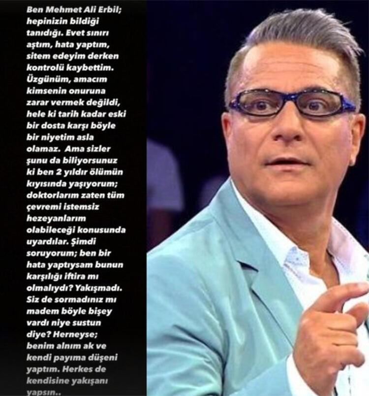 - “HATA YAPTIYSAM KARŞILIĞI İFTİRA MI OLMALIYDI?” Ünlü şovmen, “Sınırı aştım, hata yaptım, sitem edeyim derken kontrolü kaybettim. Üzgünüm, amacım kimsenin onuruna zarar vermek değildi. Hele ki tarih kadar eski bir dosta karşı böyle bir niyetim asla olamaz. İki yıldır ölümün kıyısında yaşıyorum; doktorlarım zaten tüm çevremi istemsiz hezeyanları olabileceğim konusunda uyardılar. Ben bir hata yaptıysam bunun karşılığı iftira mı olmalıydı? Yakışmadı. Siz de sormadınız mı; ‘madem böyle bir şey vardı niye sustun’ diye? Her neyse; benim alnım ak ve kendi payıma düşeni yaptım. Herkes de kendisine yakışanı yapsın” açıklamasını yapmıştı.