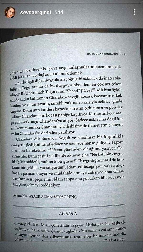 - Okuduğu kitaptan iki sayfa paylaşan Erginci, “İhanet ve kırgınlık” mesajıyla eski sevgilisine manidar bir göndermede bulundu.