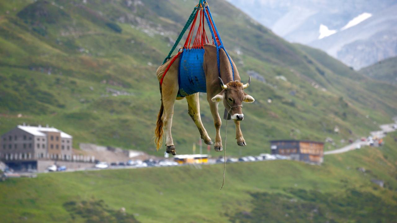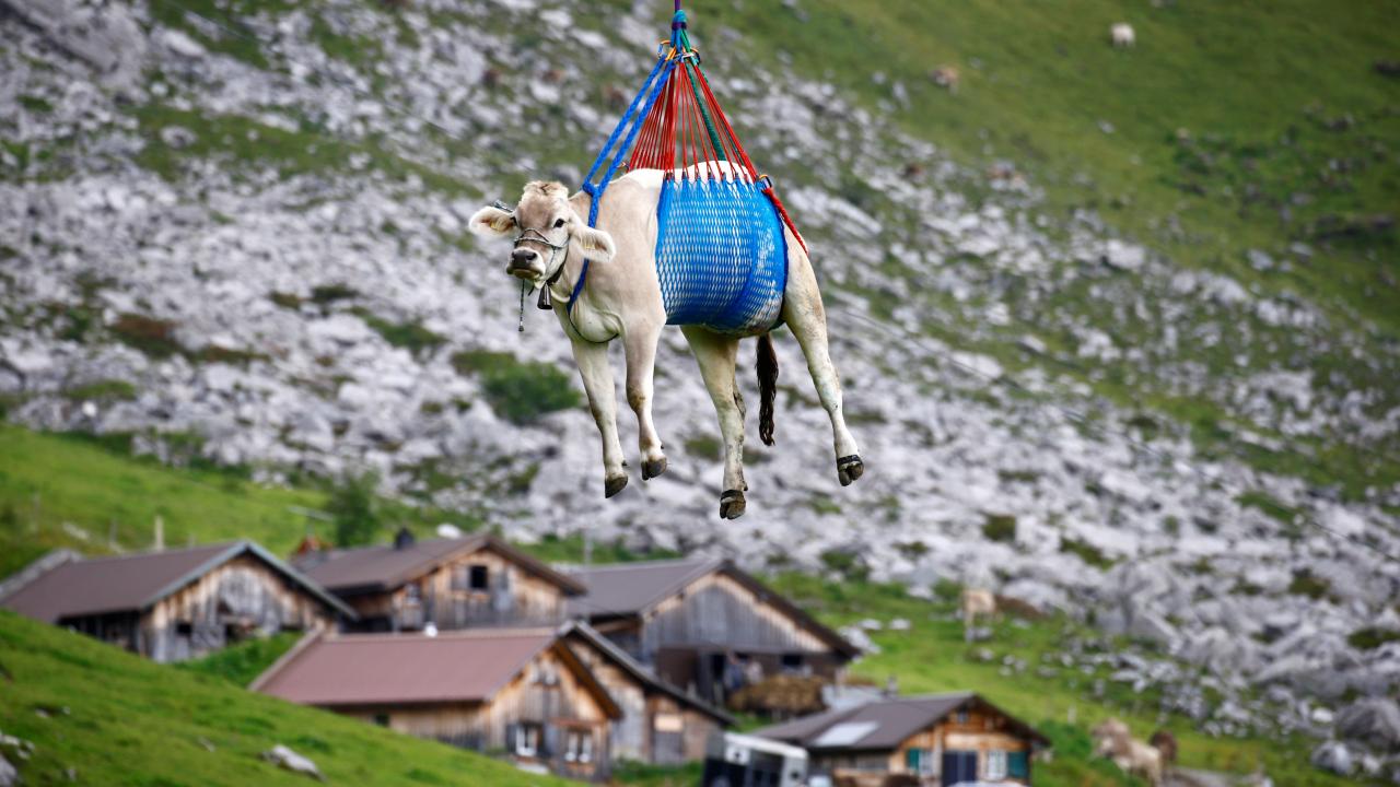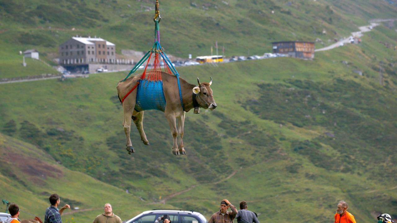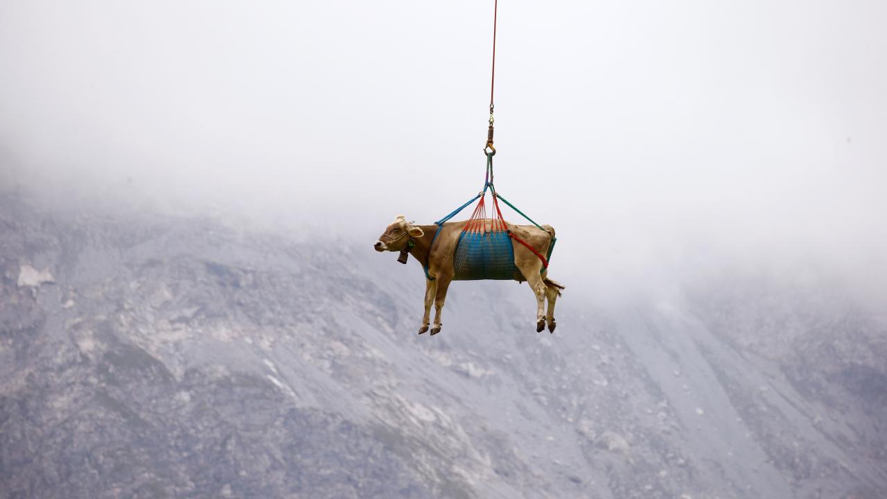 - Çiftçiler, helikopterle aşağı indirilen bir ineği bekliyor.