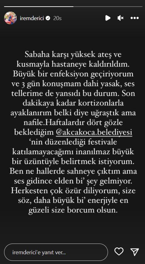 - “Sabaha karşı yüksek ateş ve kusmayla hastaneye kaldırıldım. Büyük bir enfeksiyon geçiriyorum ve 3 gün konuşmam dahi yasak, ses tellerime de yansıdı bu durum. Son dakikaya kadar kortizonlarla ayaklanırım belki diye uğraştık ama nafile”