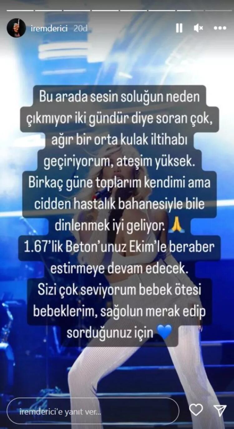- İrem Derici sessizliğinin nedenini şu sözlerle ifade etti, “Sesin soluğun neden çıkmıyor iki gündür diye soran çok.