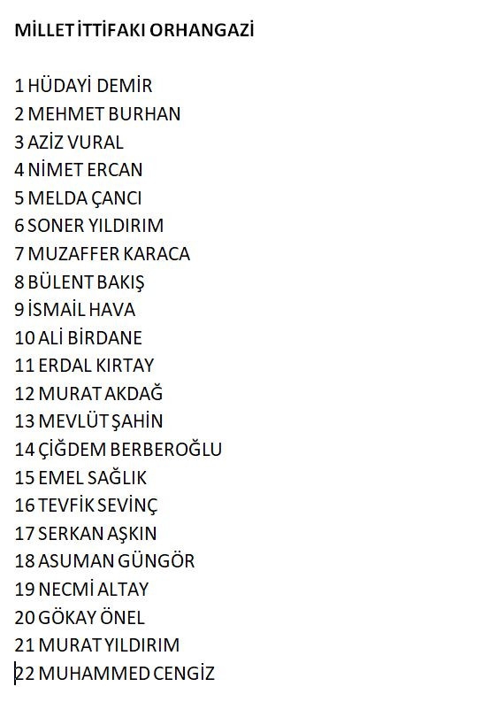 Yüksek Seçim Kurulu’nun açıkladığı seçim takvimi uyarınca siyasi partiler belediye başkan adayı ve belediye meclisi aday listelerini seçim kurullarına sundu. İşte Bursa’da Cumhur İttifakı’nın (AK PARTİ-MHP) ve Millet İttifakı’nın (CHP-İYİ Parti) bazı ilçelerindeki meclis aday listeleri…