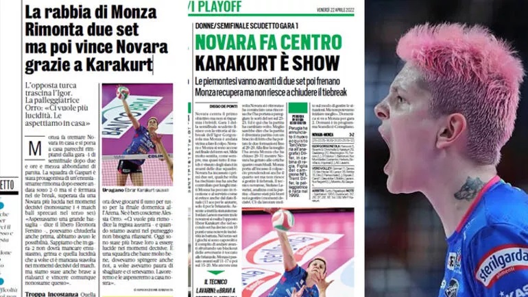 - DEV MAÇ ÖNCESİ EBRAR MANŞETLERE ÇIKTI… Igor Gorgonzola Novara ve Vero Volley Monza’nın bir önceki karşılaşmasının ardından İtalyan basını Ebrar Karakurt’u öne çıkarmıştı. Tuttosport, La Gazzetta dello Sport gibi prestijli gazetelerde performansıyla Ebrar Karakurt büyük beğeni toplamıştı.