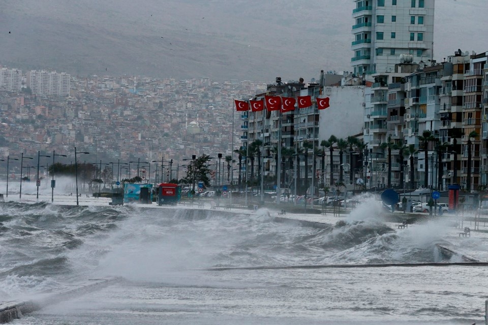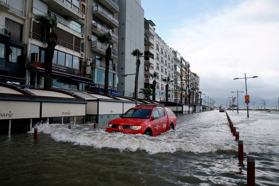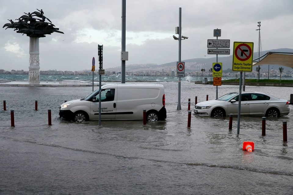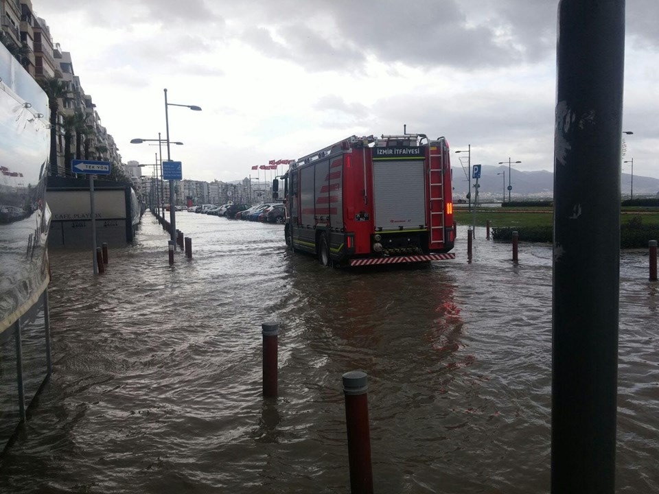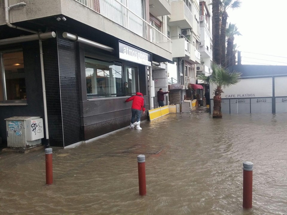 İzmir’de etkili olan fırtına nedeniyle deniz taştı, 1. Kordon’daki birçok işyerini su bastı, vapur seferleri iptal edildi. Taşma nedeniyle araçlar ve yayalar ulaşımda güçlük yaşadı, 11 ağaç devrildi.