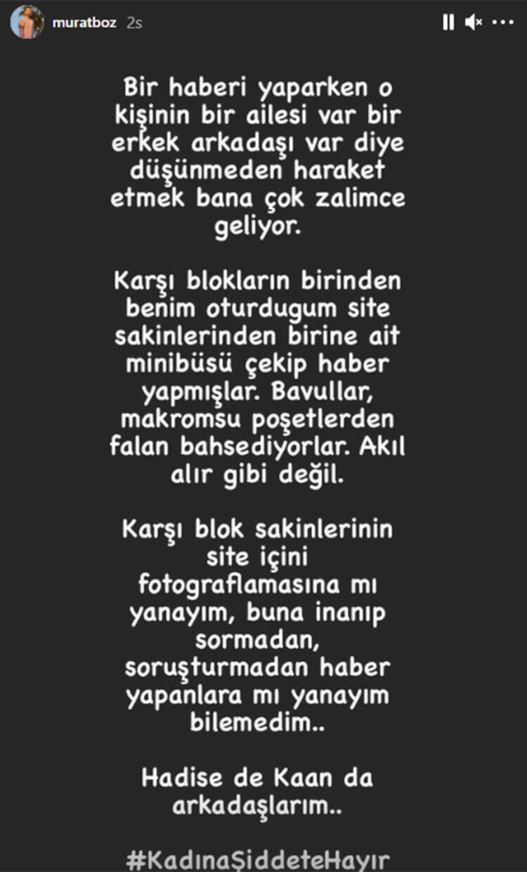 - “Karşı blok sakinlerinin site içini fotoğraflamasına mı yanayım, buna inanıp sormadan, soruşturmadan haber yapanlara mı yanayım bilemedim. Hadise de Kaan da arkadaşlarım. #KadınaŞiddeteHayır” (Milliyet)