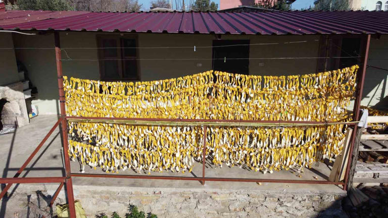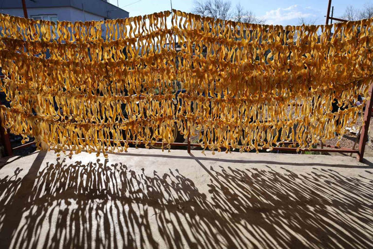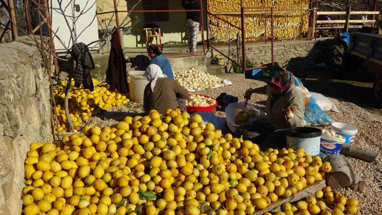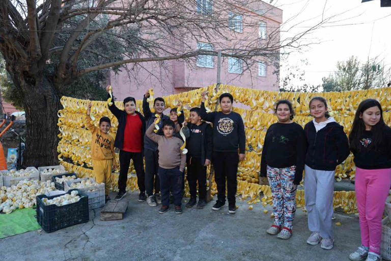 - Limon, portakal ve turunçları römorklar ile evlerinin bahçesine taşıyan Turunçlu Mahallesi sakinleri evleri önünde aileleri ile birlikte günlük yaklaşık 200 kilogram narenciye ürünün kabuklarını önce soyuyorlar ardından kuruması için çamaşır ipine bin bir emekle diziyor.