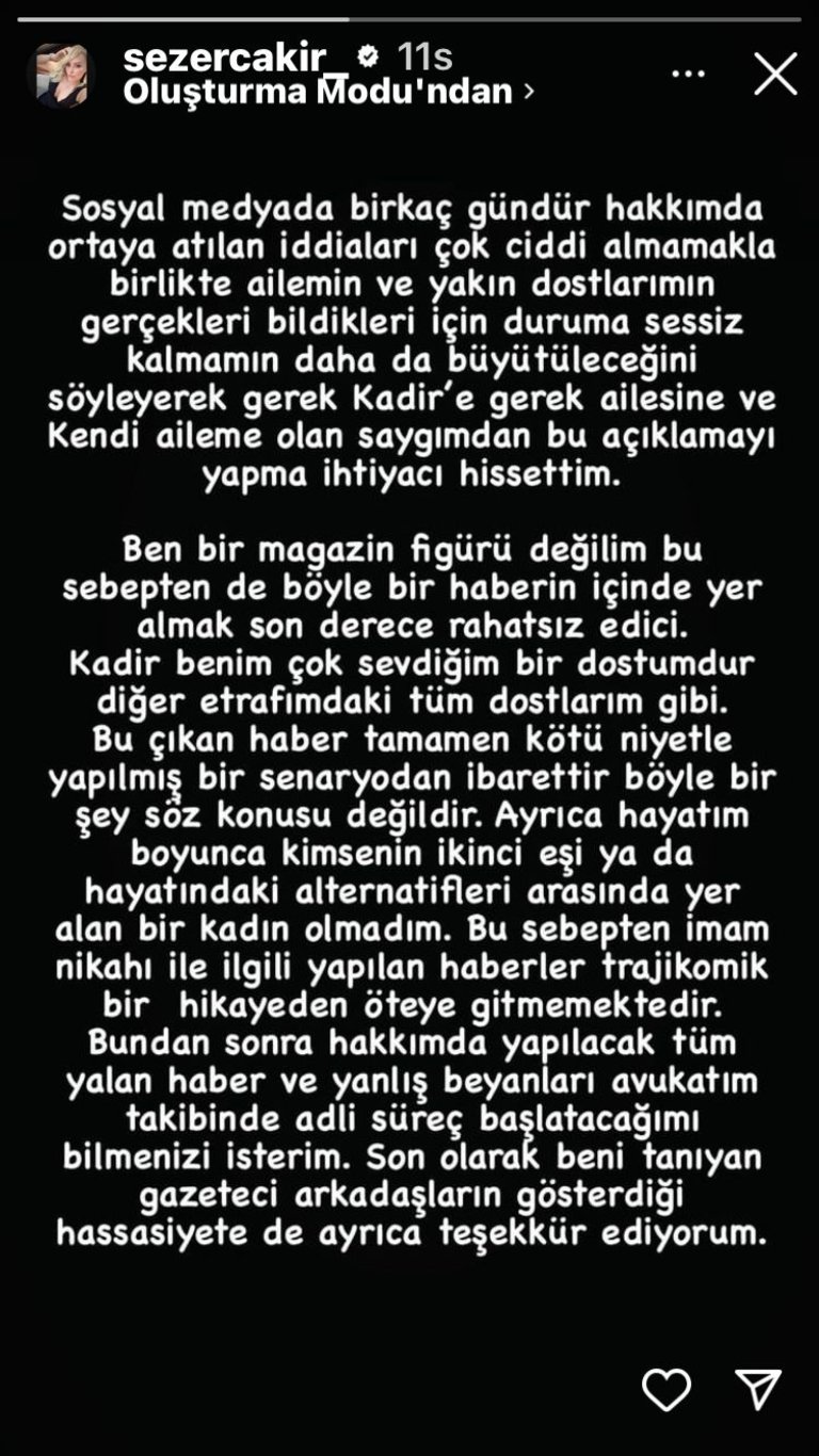 - Ben bir magazin figürü değilim. Bu sebepten de böyle bir haberin içinde yer almak son derece rahatsız edici. Kadir, benim çok sevdiğim bir dostumdur. Diğer etrafımdaki tüm dostlarım gibi… Bu çıkan haber tamamen kötü niyetle yapılmış bir senaryodan ibarettir. Böyle bir şey söz konusu değildir. Ayrıca hayatım boyunca kimsenin ikinci eşi ya da hayatındaki alternatifleri arasında yer alan bir kadın olmadım. Bu sebepten imam nikahı ile ilgili yapılan haberler trajikomik bir hikâyeden öteye gitmemektedir.