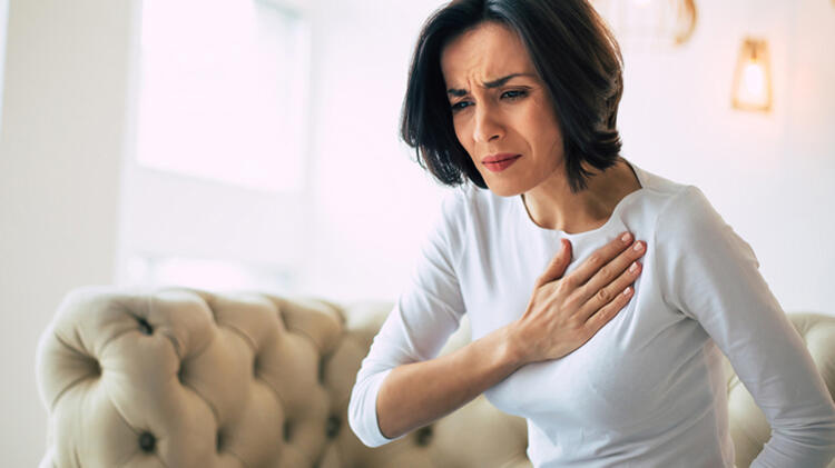 - Yaşlılarda, menopoz sonrası kadınlarda ve diyabetik hastalarda yukardaki gibi tipik bir göğüs ağrısı olmadan da kalp krizi gelişebilir. Bu hastalarda aşağıdaki belirtiler görülebilir. Mide bulantısı, hazımsızlık, mide ekşimesi veya karın ağrısı, nefes darlığı, terleme, baş dönmesi. (Milliyet)