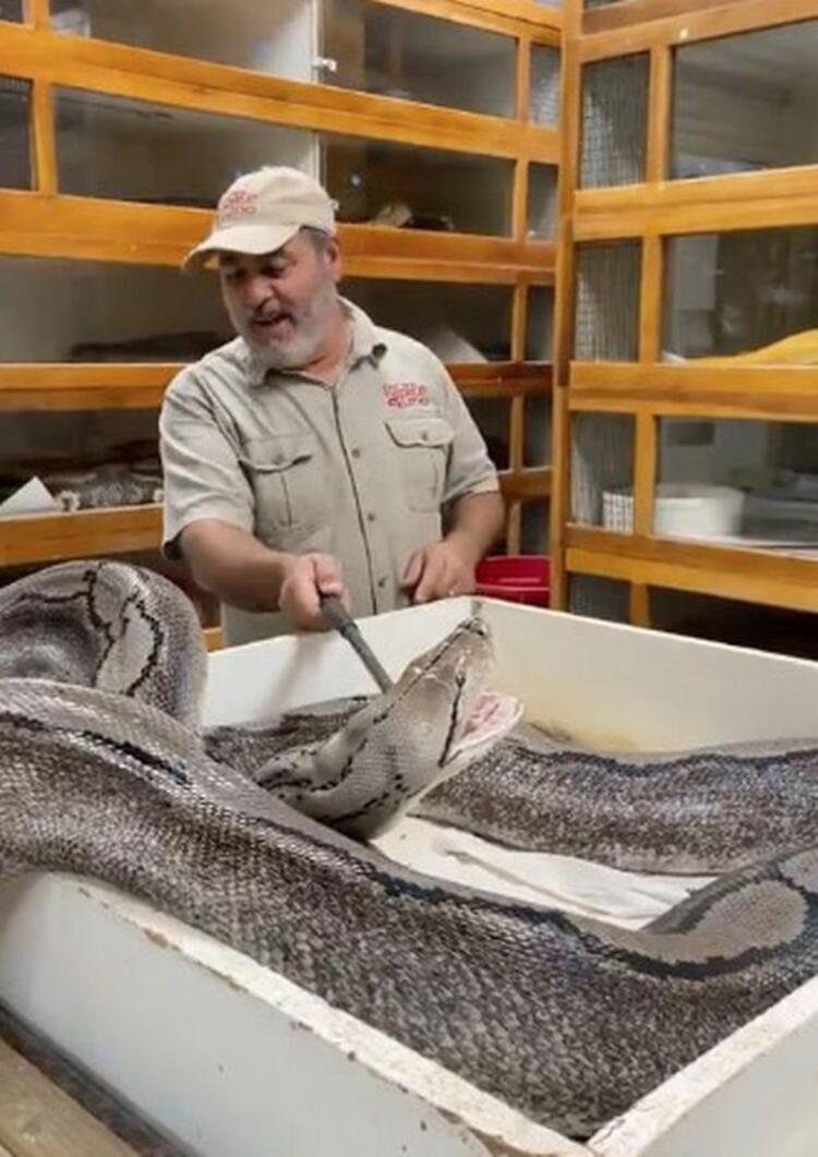 - DÜNYANIN KONUŞTUĞU GÖRÜNTÜLER… ABD California’daki Sürüngen Hayvanat Bahçesi’nin sahibi Jay Brewer, çürüme riski taşıyan yumurtalarını koruyan dev bir piton tarafından neredeyse yüzünden ısırılıyordu.