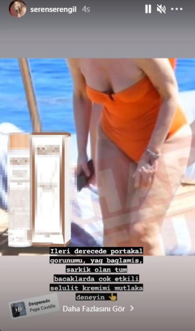 - “İLERİ DERECEDE PORTAKAL GÖRÜNÜMLÜ BACAKLARDA ETKİLİ” Serengil, Ergen’in turuncu mayolu fotoğrafını paylaşarak, “İleri derecede portakal görünümlü, yağ bağlamış bacaklarda çok etkili selülit kremimi mutlaka deneyin” dedi. Serengil’in Gülben Ergen’in fotoğrafını rencide edici şekilde paylaşması sosyal medya kullanıcılarının tepkisini çekti. (haberler.com)