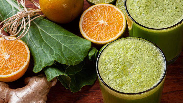 - Malzemeler: 1½ bardak çiğ ıspanak, ½ fincan portakal suyu, 1 salatalık (doğranmış), 2 yeşil elma (küçük parçalar halinde dilimlenmiş), 1 parça zencefil kökü (soyulmuş)