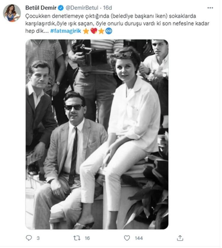 - BETÜL DEMİR: “Çocukken denetlemeye çıktığında (belediye başkanı iken) sokaklarda karşılaşırdık. Öyle ışık saçan, öyle onurlu duruşu vardı ki son nefesine kadar hep dik… “