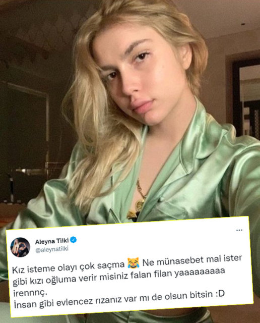 - Yaptığı açıklamalarla sık sık adından söz ettiren Aleyna Tilki (21), paylaşımlarına bir yenisini daha ekledi. Kız isteme merasimini çok saçma bulduğunu dile getiren genç şarkıcı, yeni bir tartışmanın fitilini ateşledi.
