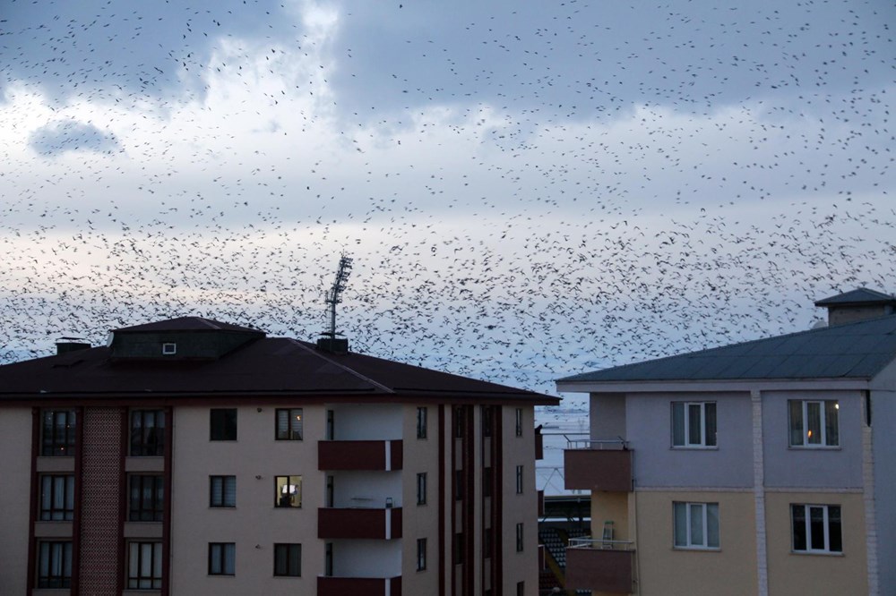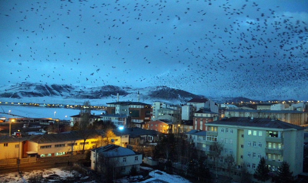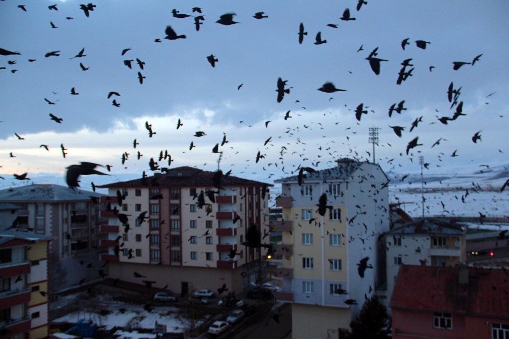 - Toplu halde gökyüzünde uzun süre uçan kargalardan bir kısmı, havanın kararması ile binaların çatısında tünerken, bir kısmı da çevredeki ağaçlara konuyor.