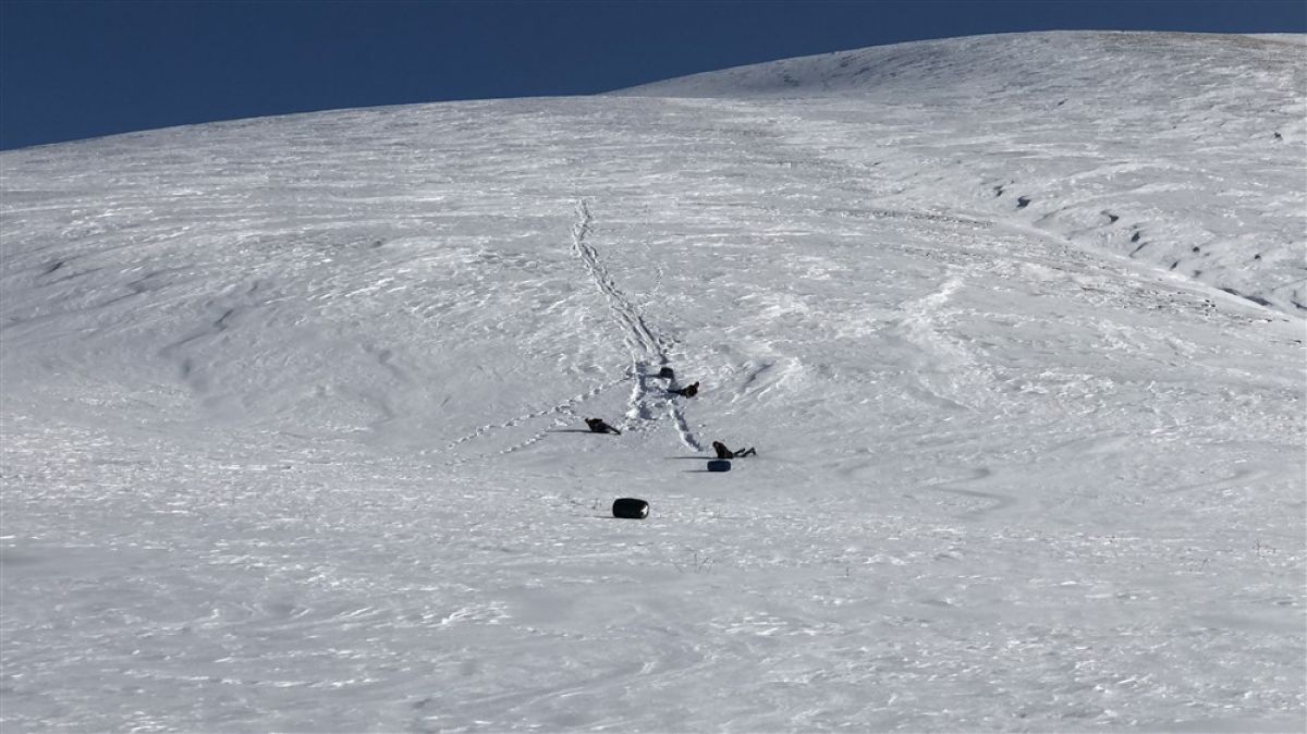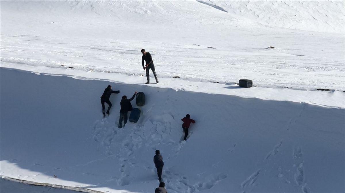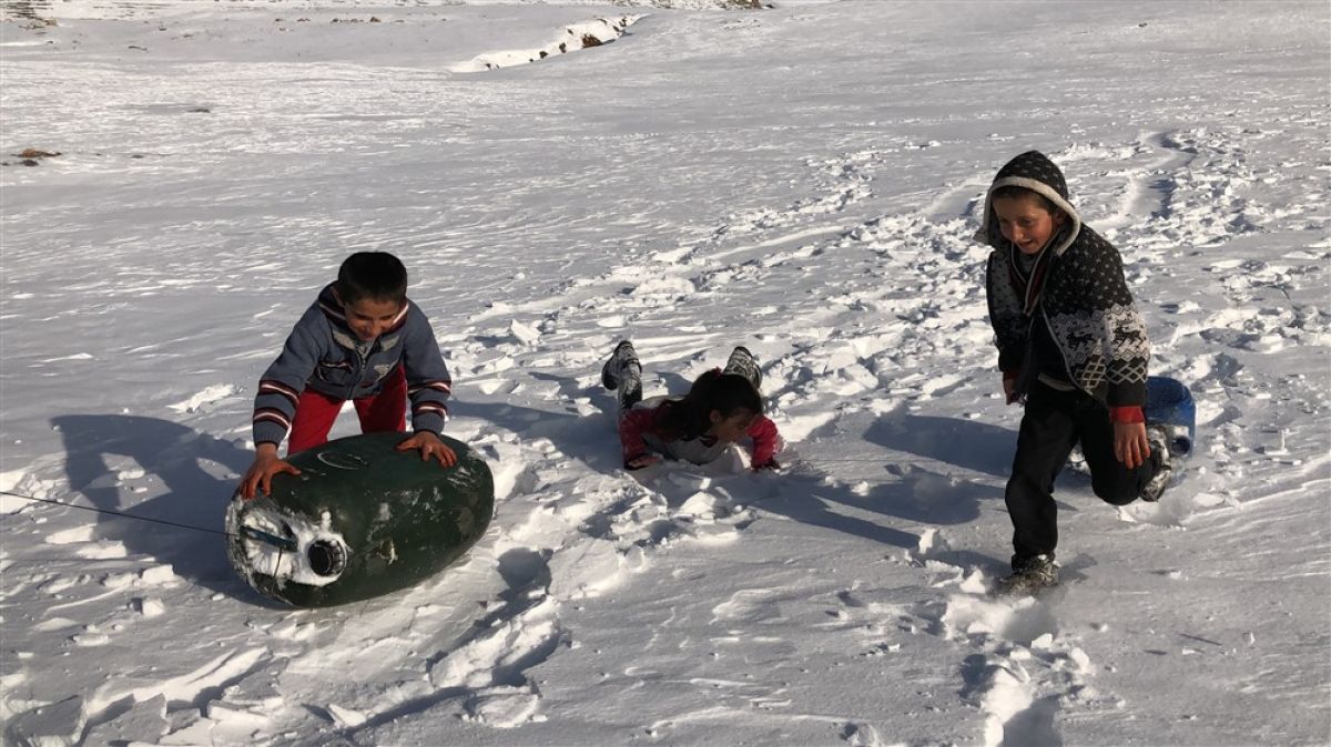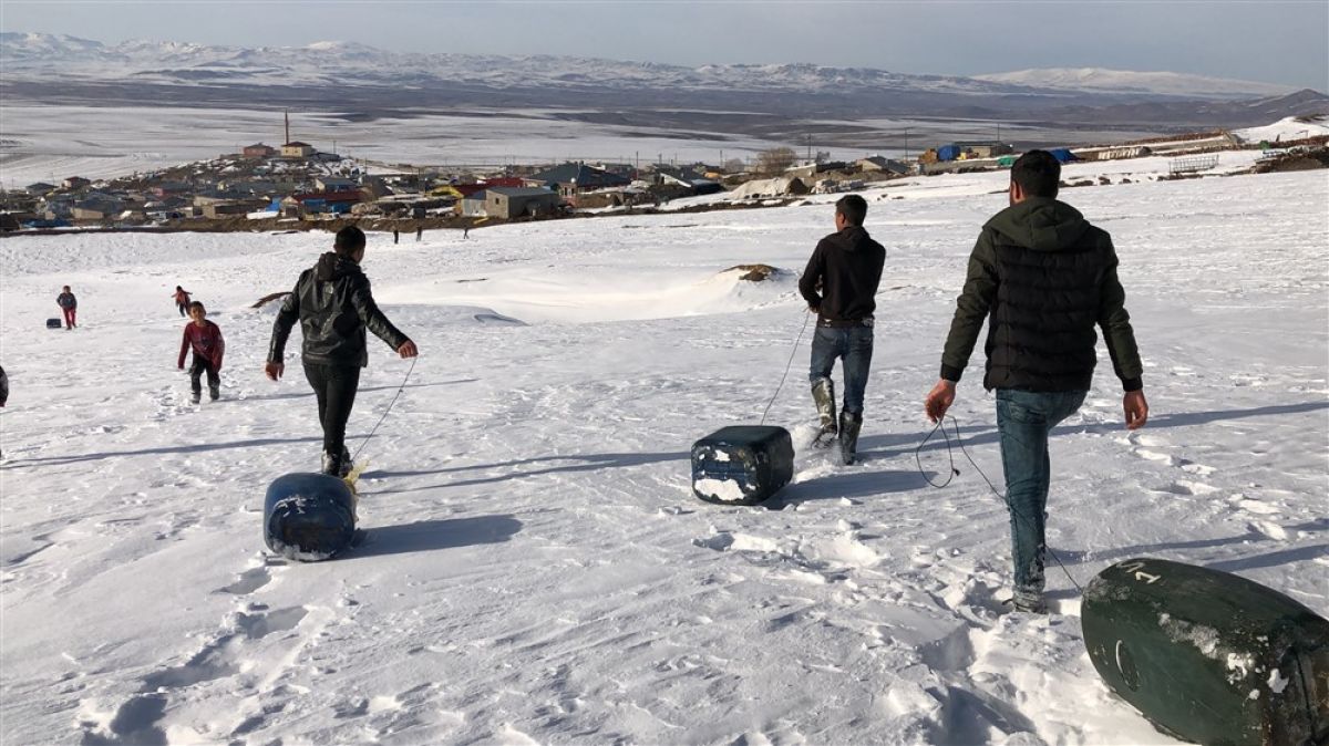 - KÖY USULÜ KAYAK… Gençler, kayak takımı olarak ise ağır su bidonlarını kullanıyor. İp bağladıkları bidonlarla dağı tırmanmaya başlayan gençler, ilk önce köy içinden geçen dereyi aşıyor. Yoğun karda yürümekte bile zorlanan gençler, bidonların da ağırlığıyla enerji sarf ediyor. Karda bata çıka dağa tırmanmayı başaran gençler, yüzüstü uzandıkları bidonlarla kaymaya başlıyor.