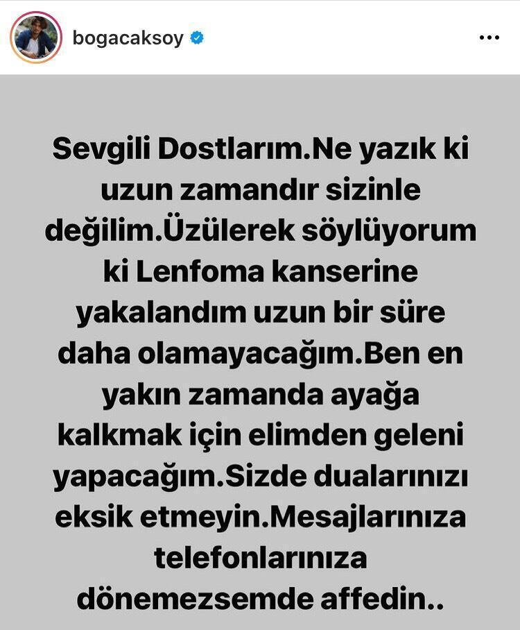 - SON KEMOTERAPİYİ ALDI… Lenf kanserine yakalanan Boğaç Aksoy, sosyal medya hesabı üzerinden son durumu hakkında bilgi verdi. 32 yaşındaki oyuncu, kemoterapi süresinin bittiğini duyurdu.