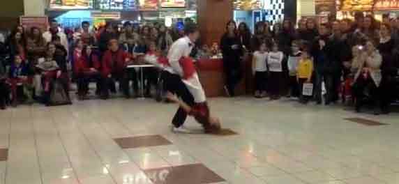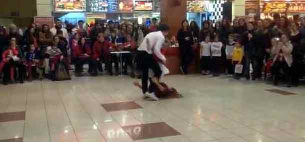 - Özel kıyafetleriyle alışveriş merkezinde dans gösterisi yapan öğrencilere müşteriler ilgi gösterdi. Latin dansının değişik figürlerini sergileyen öğrencilere alışveriş merkezindekiler alkışlarla tempo tutarak destek verdi. Alışveriş merkezinin kaygan beton zemininde lise öğrencisi Göktuğ Fıçıyapan ile dans eden Aleyna Özden ile kavalyesinin kucağına atlayıp el ele tutuşmak istedi.