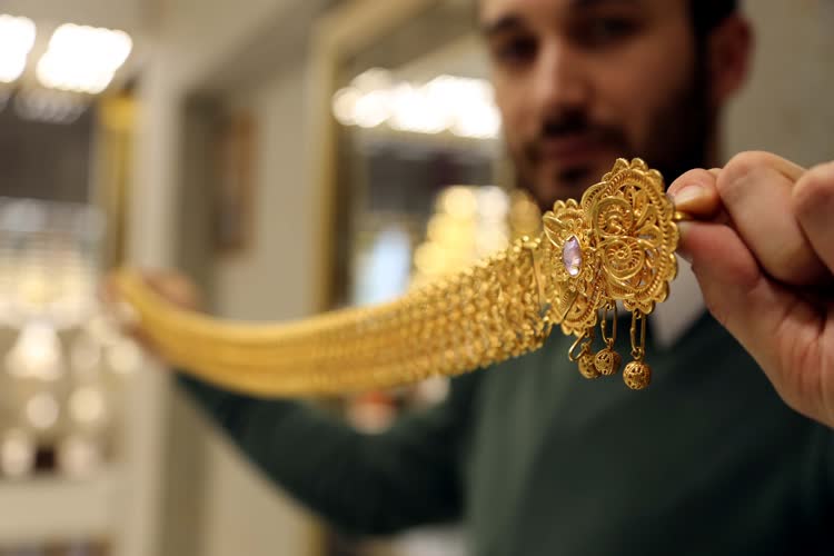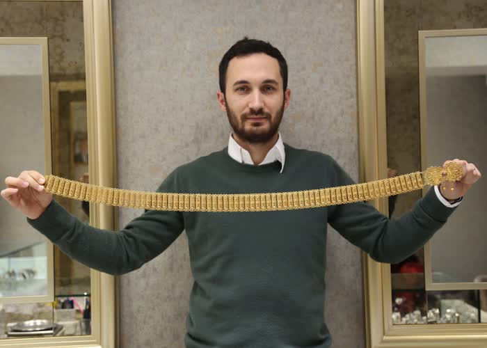 Lüks araba fiyatına ‘altın kemer’ Bursa’da, tarihi Kapalıçarşı’da bir kuyumcu vitrininde sergilenen, 22 ayar altından üretilen 936 gramlık kemer, 118 bin liralık fiyatıyla dikkati çekiyor. 16 26 36 46 56 66