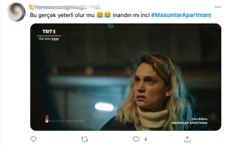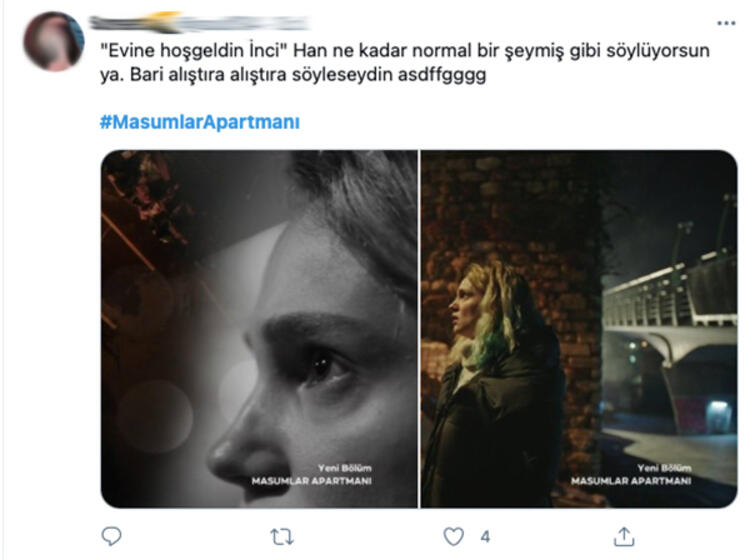 - Başrollerini Ezgi Mola, Merve Dizdar, Birkan Sokullu ve Farah Zeynep Abdullah’ın paylaştığı, Dr. Gülseren Budayıcıoğlu’nun kitabından uyarlanan ve gerçek bir hikayeyi anlatan ‘Masumlar Apartmanı’na Han ve İnci damga vurdu.