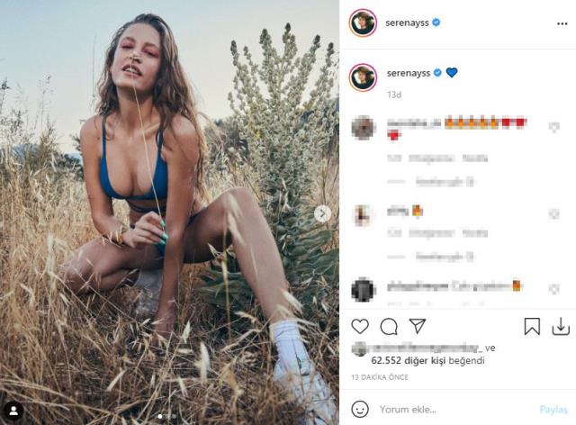 - Son günlerde verdiği pozlarla sık sık adından söz ettiren oyuncu Serenay Sarıkaya, bir dergi için mavi bikinisiyle yeşilliklerin arasında poz verdi. Fotoğraflarını Instagram hesabından yayınlayan oyuncu, yorum ve beğeni yağmuruna tutuldu.