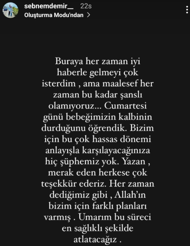 - “BEBEĞİMİZİN KALBİ DURDU” Demir’in yengesi Şebnem Demir, Instagram hesabından yaşadığı acıyı paylaşarak “Buraya her zaman iyi haberle gelmeyi çok isterdim ama maalesef her zaman bu kadar şanslı olamıyoruz. Cumartesi günü bebeğimizin kalbinin durduğunu öğrendik. Bizim için bu çok hassas dönemi anlayışla karşılayacağınızı hiç şüphemiz yok. Yazan, merak eden herkese çok teşekkür ederiz. Her zaman dediğimiz gibi Allah’ın bizim için farklı planları varmış. Umarım bu süreci en sağlıklı şekilde atlatacağız” dedi. Yakışıklı oyuncudan acı kayıpla ilgili bir açıklama gelmedi.