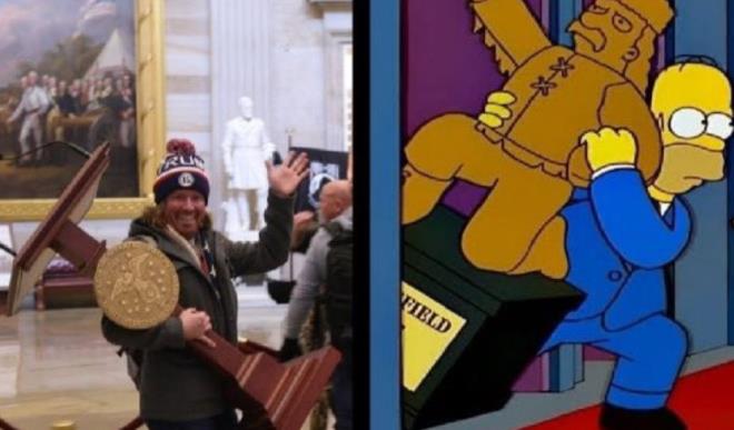 - Sosyal medyada en çok paylaşılan görsellerden bir diğeri de Kongre binasına giren yağmacılardan kürsü çalan adamın fotoğrafı ile Homer Sipmson’ın heykel çaldığı sahneden bir kare oldu.