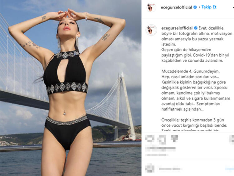 - Ece Gürsel’in açıklaması şöyle: “Evet, özellikle böyle bir fotoğrafın altına, motivasyon olması amacıyla bu yazıyı yazmak istedim. Geçen gün de hikayemden paylaştığım gibi, Covid-19’dan bir yıl kaçabildim ve sonunda avlandım…”