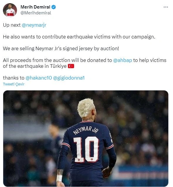 - Milli savunma oyuncusu Merih Demiral, sosyal medya hesabından yaptığı paylaşımda, “O da kampanyamızla depremzedelere katkıda bulunmak istiyor. Neymar Jr imzalı formasını açık arttırmayla satıyoruz! Müzayededen elde edilecek tüm gelir, Türkiye’deki depremzedelere yardım için bağışlanacak.” ifadelerine yer verdi.(tv100)