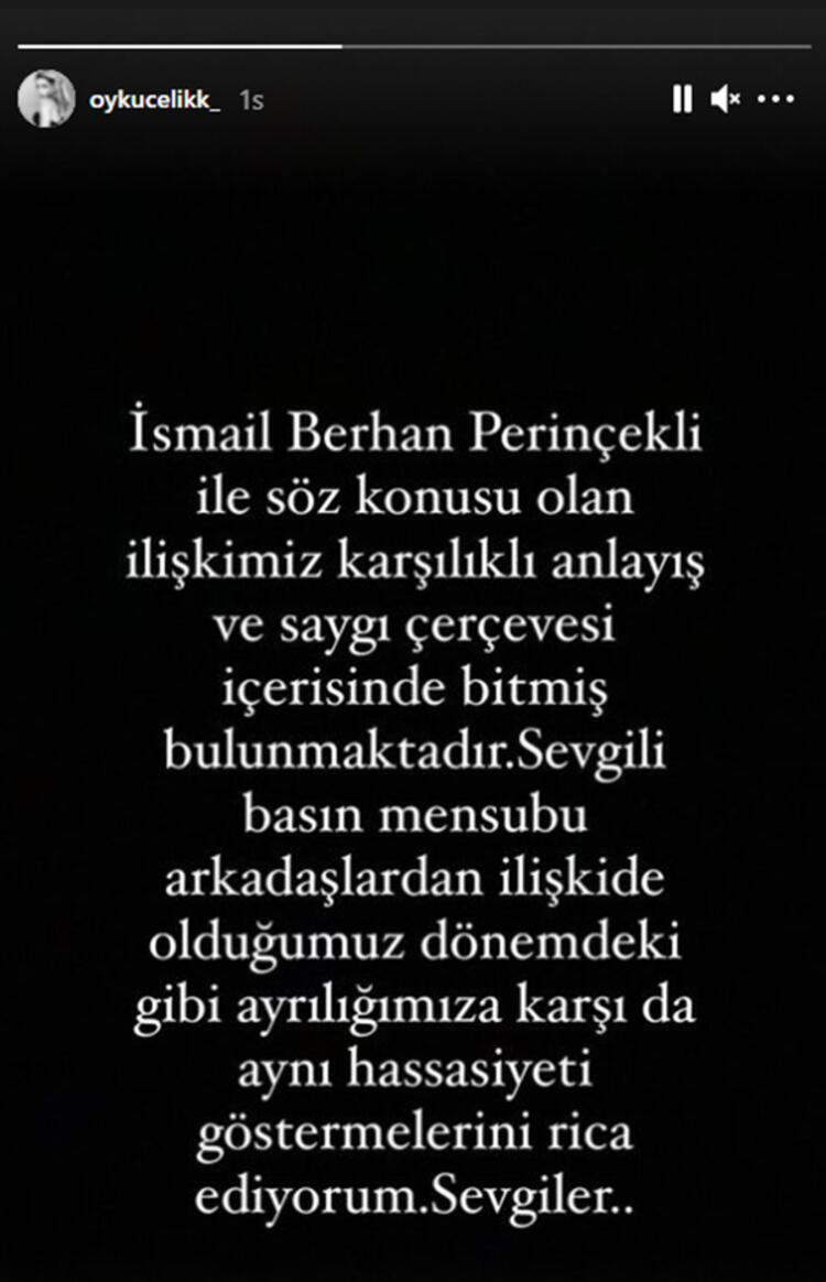 - Güzel oyuncu, açıklamasında; “İsmail Berhan Perinçekli ile söz konusu olan ilişkimiz karşılıklı anlayış ve saygı çerçevesinde bitmiş bulunmaktadır. Sevgili basın mensubu arkadaşlar ilişkide olduğumuz dönemdeki gibi ayrılığımıza da aynı hassasiyeti göstermelerini rica ediyorum. Sevgiler” ifadelerini kullandı.