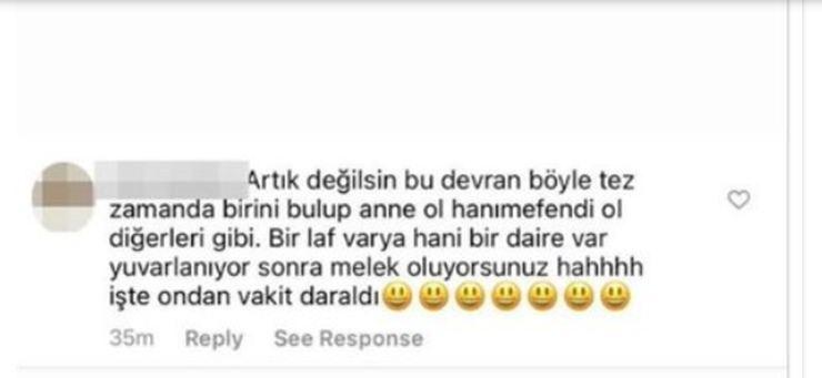 - Ulusoy, paylaşımlarından gelen bir yorumu görünce çıldırdı. “Şu terbiyesize bakın” diyerek takipçisini ifşa etti. Yorumda, “Tez zamanda anne ol, hanımefendi ol, diğerleri gibi. Bir laf var ya hani, bir daire var yuvarlanıyor, sonra melek oluyorsunuz işte ondan vakit daraldı.” yorumunu gören Özge Ulusoy’un tepkisi çok sert oldu.