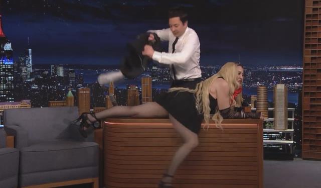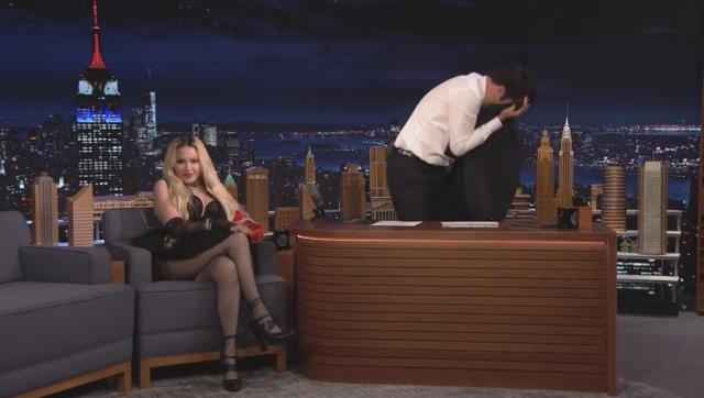 - Jimmy Fallon’un Tonight Show programına konuk olan Madonna, “Biraz yetişkin sohbeti yapalım” diyerek önce sunucu masasına uzandı sonra da seyirciye dönerek eteğini kaldırdı. Madonna’nın hamlesiyle ne yapacağını şaşıran sunucu ise ceketini çıkartarak şarkıcının üzerini örttü.