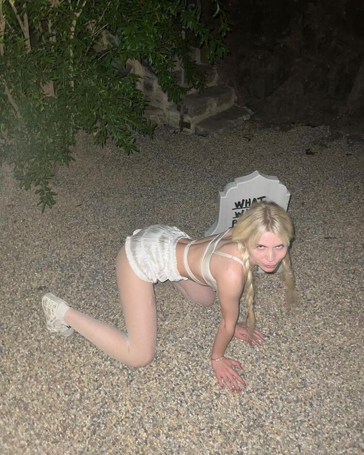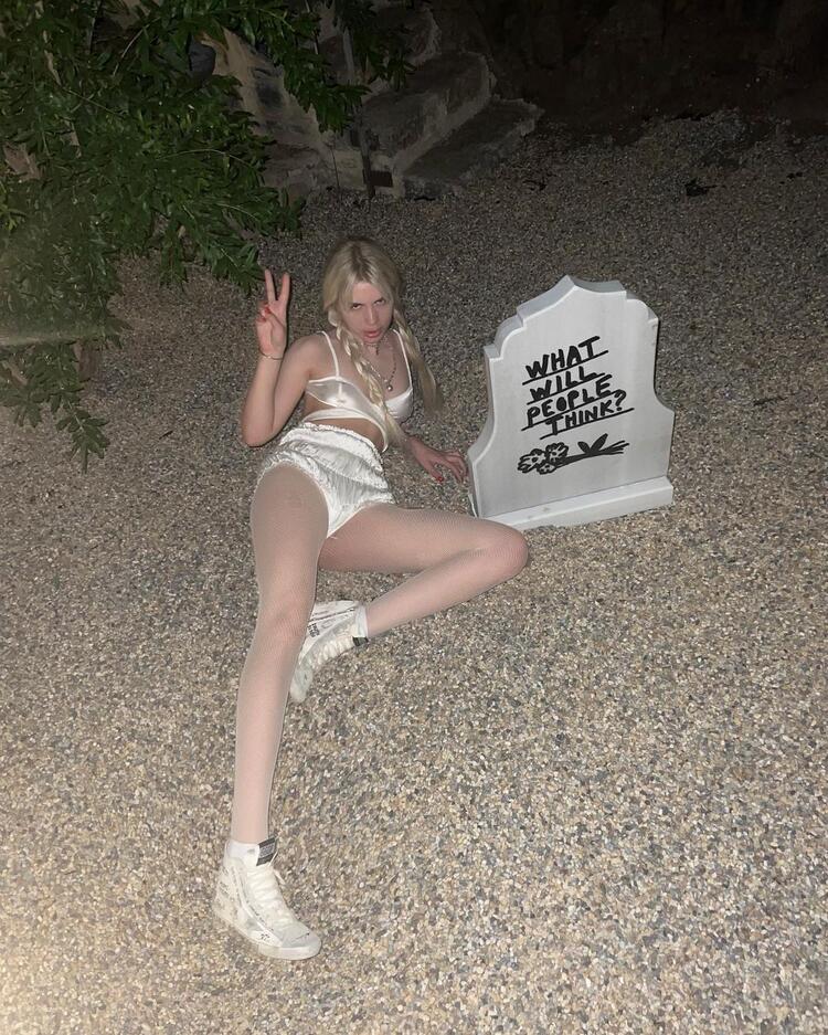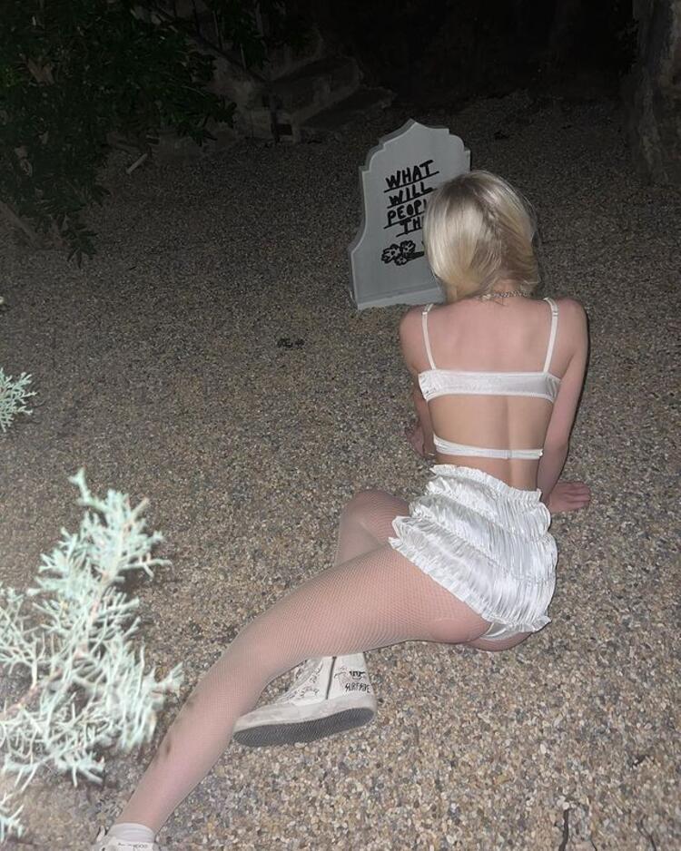 - Tilki daha sonra o kıyafetlerle üzerinde İngilizce “İnsanlar ne düşünecek” yazan mezar taşıyla poz verdi.