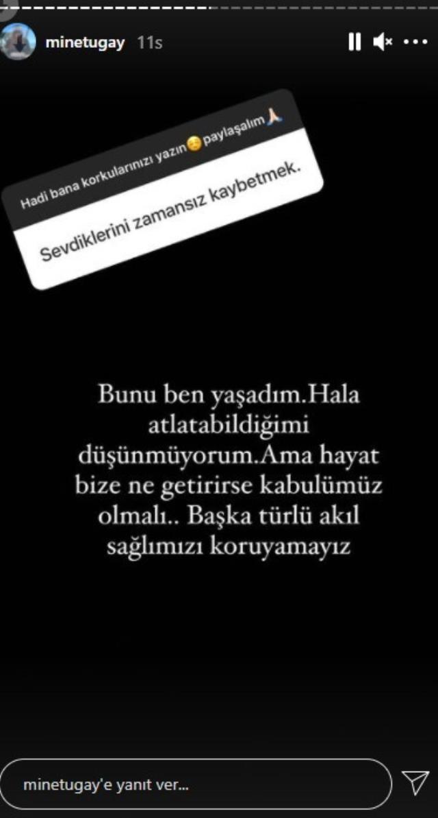 - “HALA ATLATAMADIM” Bir takipçisinden gelen “Sevdiklerini zamansız kaybetmek” cevabına verdiği tepkiyle dikkat çeken Mine Tugay, “Bunu ben yaşadım. Hala atlatabildiğimi düşünmüyorum. Ama hayat bize ne getirirse kabulümüz olmalı. Başka türlü akıl sağlığımızı koruyamayız” ifadelerini kullandı. (haberler.com)