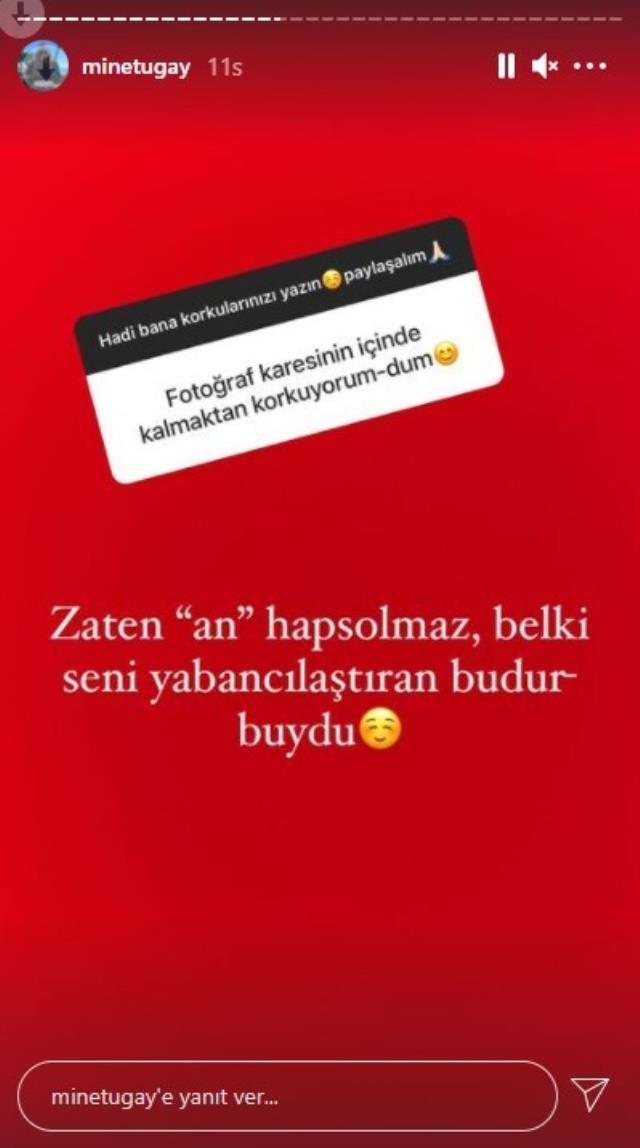 - Medcezir ve Paramparça gibi dizileriyle ünlenen başarılı oyuncu Mine Tugay, sosyal medya paylaşımlarıyla dikkat çekmeye devam ediyor. Güzel oyuncu, sosyal medya hesabından takipçilerinin korkularını sordu. Gelen cevaplar üzerine takipçilerine destek mesajları gönderen Mine Tugay, hayranlarıyla dertleşti.