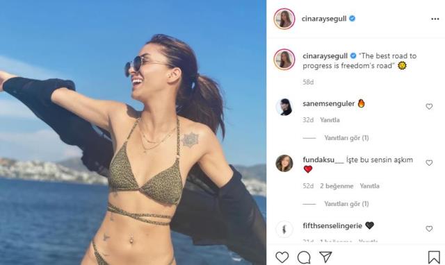 - BİKİNİLİ POZUNA BEĞENİ YAĞDI… Ayşegül Çınar, dolu dizgin devam eden tatilinden kareleri takipçileriyle paylaşmayı da ihmal etmiyor. Güzel oyuncu son olarak tekne üzerinden verdiği bikinili pozunu sosyal medya hesabından paylaştı. Fit görüntüsü ve düzgün fiziğiyle dikkat çeken Çınar’ın fotoğrafı, kısa sürede çok sayıda beğeni aldı. Çınar’ın fotoğrafına yorum yapanlardan biri de arkadaşı Funda Aksu oldu. Aksu, fotoğrafın altına “İşte bu sensin aşkım” yorumunda bulundu. (haberler.com)