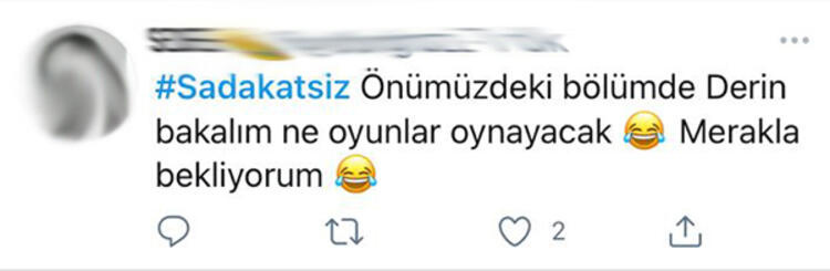 - Başrollerini Cansu Dere, Caner Cindoruk, Melis Sezen, Özge Özder ve Yeliz Kuvancı’nın paylaştığı ‘Sadakatsiz’ dün akşam 28. bölümüyle ekranlara geldi. Son bölüme Derin ve Gönül arasındaki konuşma ve Derin’in düşük yapması damga vurdu.