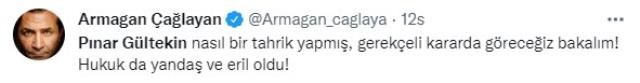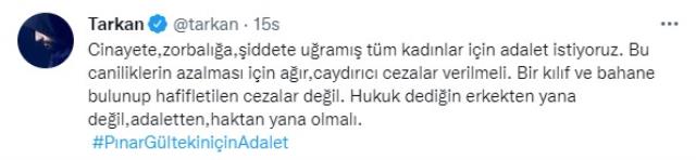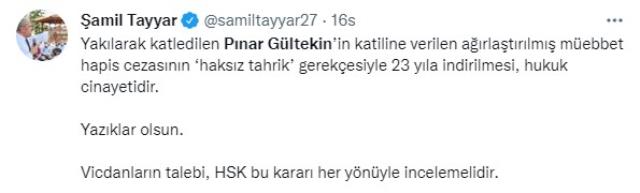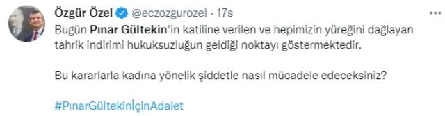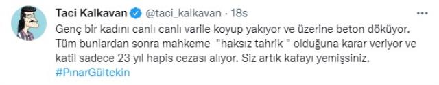 - SOSYAL MEDYA AYAĞA KALKTI… Katile verilen 23 yıllık hapis cezası kararı tüm Türkiye’yi ayağa kaldırdı. Sosyal medyada konuyla ilgili yüz binlerce tweet atıldı. Pınar Gültekin’in ismi kısa sürede Twitter’da TT oldu. Öte yandan birçok siyasetçi ve ünlü isim de karara tepki gösteren paylaşımlar yaptı. İşte o paylaşımlardan bazıları: (Haberler.com)
