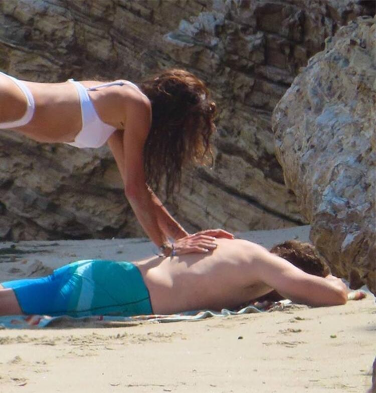 - SIRT MASAJI… Aşıklar, bir ara kumsalda gözlerden uzak bir köşeye çekildi. O sırada ünlü oyuncu, yüzüstü bir şekilde kumsalda uzanan sevgilisine masaj yaptı.