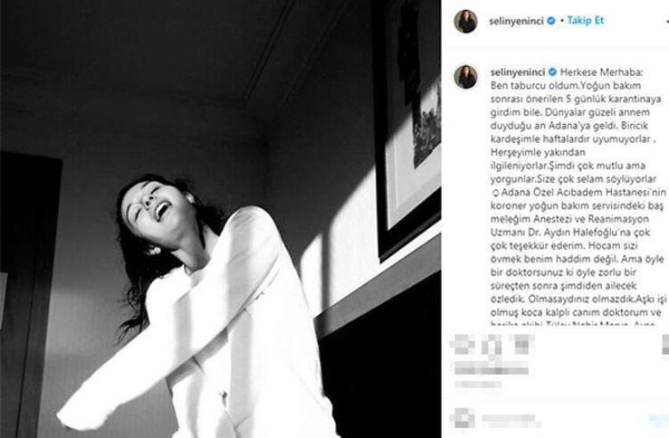 - ‘ŞİMDİ ÇOK MUTLU AMA YORGUNLAR’ Selin Yeninci, Instagram hesabından şu mesajı yayınladı: “Ben taburcu oldum. Yoğun bakım sonrası önerilen beş günlük karantinaya girdim bile. Dünyalar güzeli annem duyduğu an Adana’ya geldi. Biricik kardeşimle haftalardır uyumuyorlar. Her şeyimle yakından ilgileniyorlar. Şimdi çok mutlu ama yorgunlar. Size çok selam söylüyorlar…”