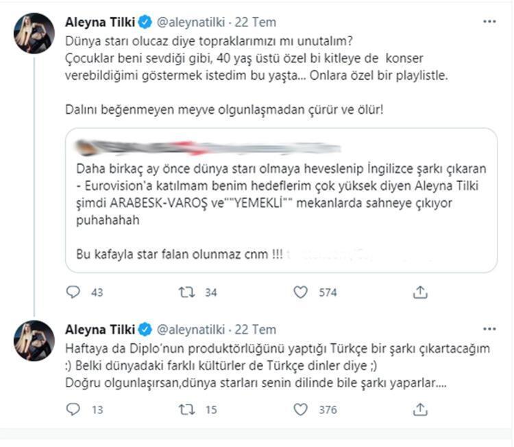 - “DALINI BEĞENMEYEN MEYVE OLGUNLAŞMADAN ÇÜRÜR VE ÖLÜR” Geçtiğimiz günlerde Çeşme’deki bir mekanda sahne alan Tilki, bir takipçisinin eleştirisine maruz kalmıştı. Twitter kullanıcısı, “Daha birkaç ay önce dünya starı olmaya heveslenip İngilizce şarkı çıkaran, ‘Eurovision’a katılmam, benim hedeflerim çok yüksek’ diyen Aleyna Tilki; şimdi arabesk ve yemekli mekanlarda sahneye çıkıyor” mesajını yayınlamıştı.