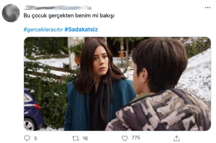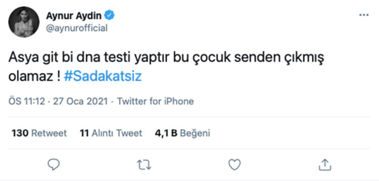 - Diziyi ilgiyle takip eden şarkıcı Aynur Aydın ise “Asya bir git DNA testi yaptır, bu çocuk senden çıkmış olamaz” diye tweet attı.