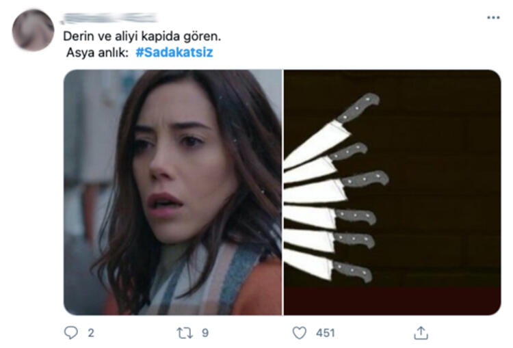 - ALİ’NİN DAVRANIŞLARI GÜNDEM OLDU ‘Sadakatsiz’in final sahnesinde; Ali, Derin’le eve geldi ve Derin, Asya’ya eşya toplamaya geldiklerini, Ali’nin kendileriyle yaşayacağını söyledi. Ali’nin tavırları sosyal medyaya damga vurdu. İşte o yorumlardan bazıları;